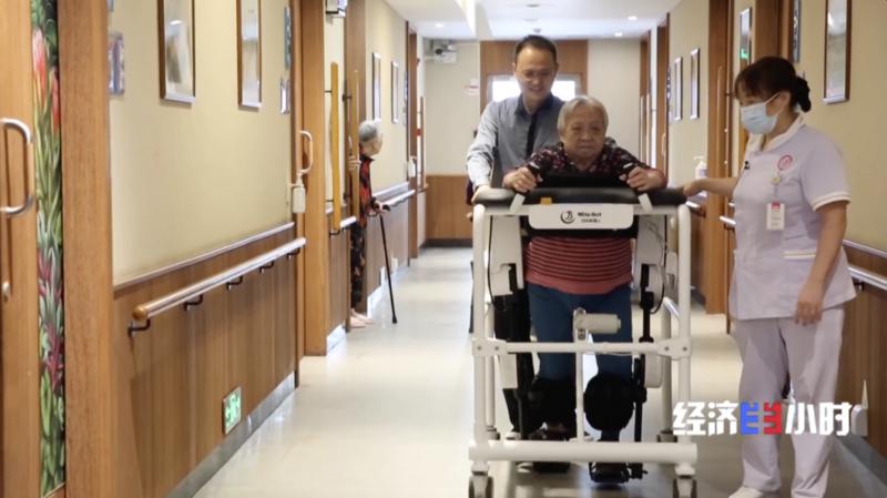 最近,颐养院里来了一个机器人“大宝贝”——下肢外骨骼机器人,双腿双脚固定好后,电动座椅托着老人慢慢“站立”。在它的辅助下,梁彩棠老人在楼道里溜达了起来。